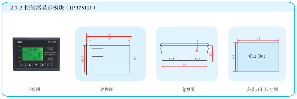 控制器主機采用穿芯式電流信號輸入方式,電機額定電流在100A以下時(shí)直接使用主機本體電流互感,電機額定電流在100A以上電流信號需外接3只通用電流互感器??刂破髦鳈C和顯示模塊采用分離式的安裝方式,主機采用35mm導軌安裝,表頭采用開(kāi)孔嵌入式安裝,能滿(mǎn)足常用的GCS、GCK、MZC等開(kāi)關(guān)柜和抽屜柜的安裝要求。