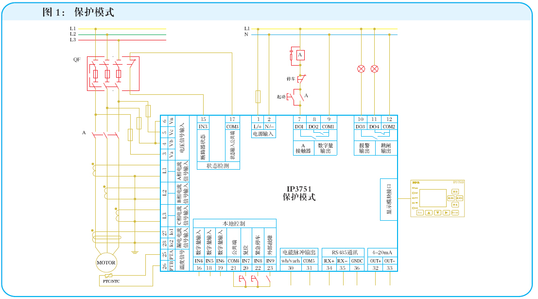 IP3751智能電機保護控制器(以下簡(jiǎn)稱(chēng)控制器)是新一代全功能的電機保護控制器。在電機發(fā)生過(guò)熱、過(guò)載、短路、堵轉、欠載、欠功率、欠壓、過(guò)壓、相序、缺相/不平衡、接地、漏電和起動(dòng)加速超時(shí)等故障時(shí)予以保護,同時(shí)可實(shí)現測量、顯示、通訊、控制、診斷和故障管理等功能。