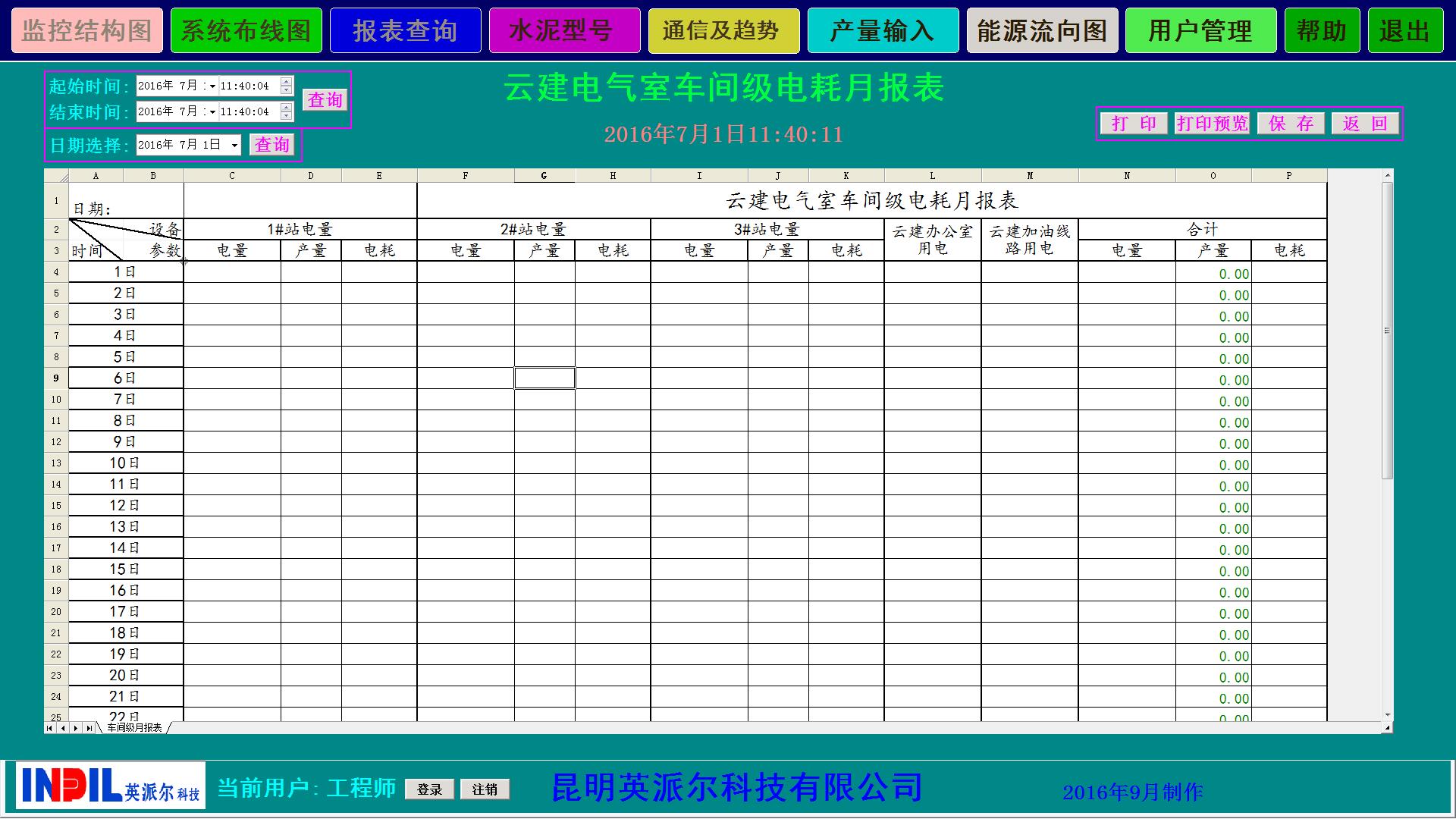 管理系統自動(dòng)生成的電能信息統計圖形、曲線(xiàn)和報表,以班、日、周、月、年為周期的電能耗統計報表,報表類(lèi)型分為電壓等級、車(chē)間、重要耗能設備三個(gè)層次,報表能以EXCEL類(lèi)型導出。