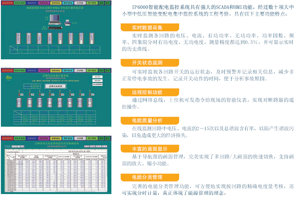 IP6000能源管理系統就是采用先進(jìn)的計算機技術(shù)、網(wǎng)絡(luò )通訊技術(shù)、控制技術(shù)和軟件技術(shù),專(zhuān)門(mén)針對中低壓用戶(hù)開(kāi)發(fā)的配電監控、分析和管理信息系統,是一種開(kāi)放式、單元化、可擴展的變配電綜合電力自動(dòng)化系統。該系統由開(kāi)關(guān)配以具有通信功能的6000系列數字電力儀表,經(jīng)數字通信與計算機系統網(wǎng)絡(luò )連接,即可實(shí)現配電設備運行管理的自動(dòng)化、智能化。完成數據的實(shí)時(shí)采集、數字通信、遠程操作與程序控制、保護定值管理、事件記錄與告警、故障分析、各類(lèi)報表及設備維護信息管理等功能。