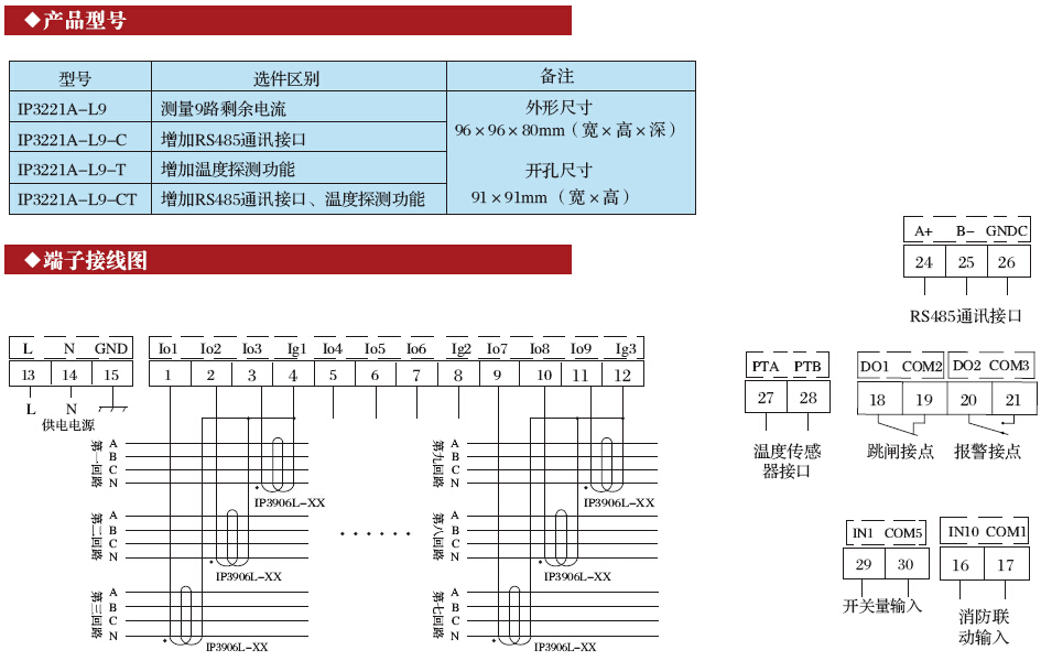 IP3221A-L9電氣火災監控探測器主要用于同時(shí)測量九路剩余電流和一路溫度,液晶顯示。