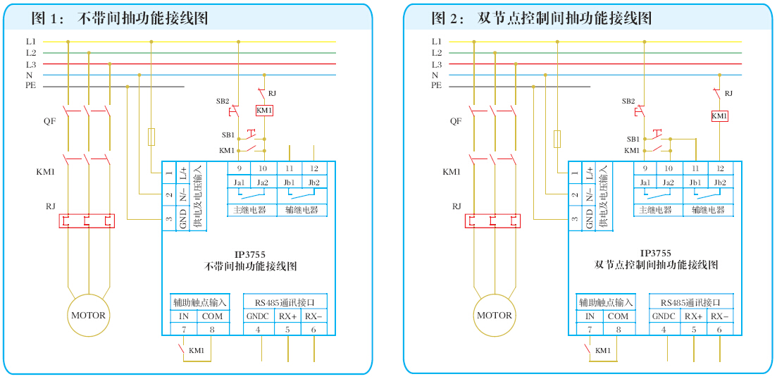 IP3755低壓電機再起動(dòng)控制器在間抽工作模式下,用戶(hù)根據需要可自由設置電機運行時(shí)間和停止時(shí)間(最小計時(shí)單位為6分鐘),同時(shí)可選擇單接點(diǎn)控制方式或雙接點(diǎn)控制方式。