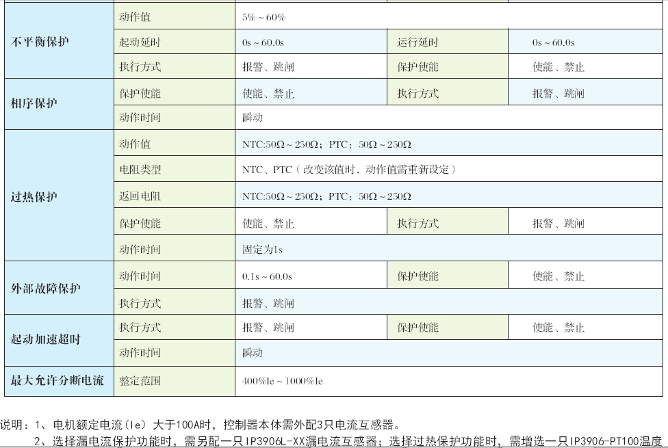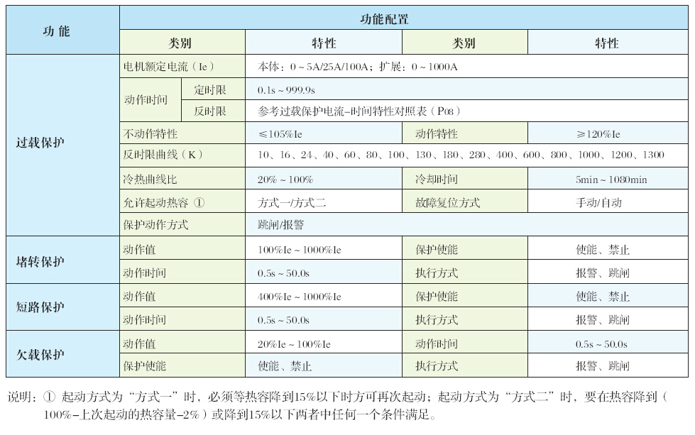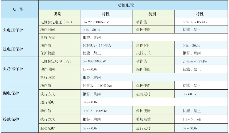 控制器提供了多種保護方式:過(guò)載保護、堵轉保護、欠載保護、欠功率保護、相序保護、缺相/不平衡保護、接地保護、漏電保護、欠電壓保護、過(guò)電壓保護、過(guò)熱保護外部故障保護(工藝聯(lián)鎖保護)、起動(dòng)加速超時(shí)保護、最大允許分段電流。