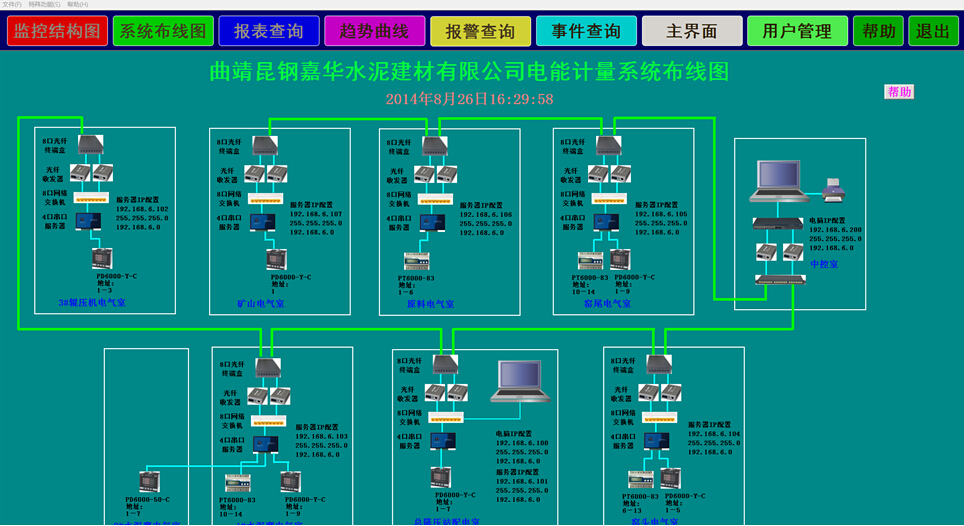 3、各電氣室收集的電能數據通過(guò)光纖、交換機等設備傳輸到后臺通訊管理器,最終通過(guò)計量計算機進(jìn)行終端統計顯示。電能計量的通訊管理器放置于工程師站,計量計算機安裝兩臺,一臺放置于總降壓站,一臺放置于中控室。