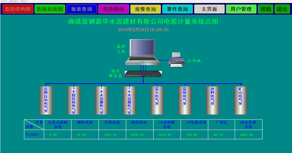 1、電能計量以各道工序為主體,基本分為:總降壓站、礦山、生料、窯、煤磨、1#水泥磨、2#水泥磨、包裝、原料、供輔(空壓機和水處理)、化驗室(包括中控室)及生活區共12個(gè)計量單元;