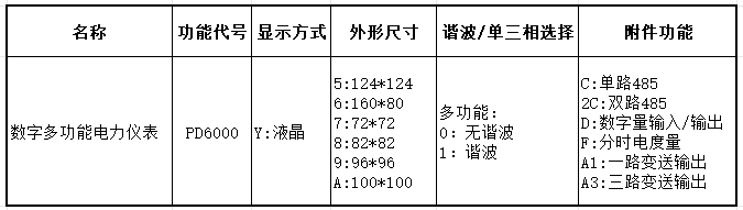 例:PD6000-Y90-CFA1表示96*96結構,不帶諧波,RS485通訊,帶變送輸出,帶分時(shí)電度量。